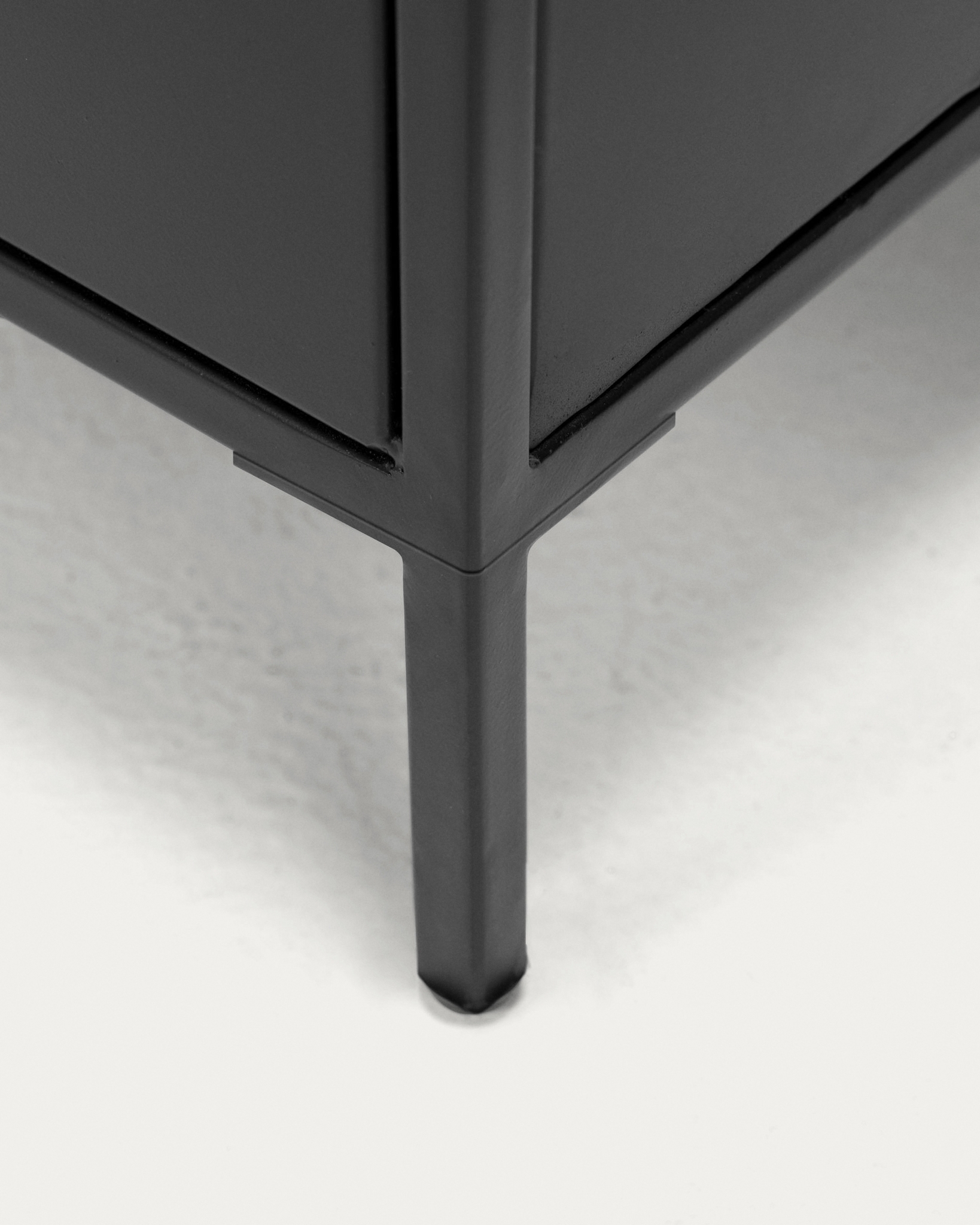 Тумба под ТВ Shantay 150 x 50 cm от фабрики La Forma – стильная конструкция для поклонников промышленного дизайна. Тумба под ТВ Shantay безусловно выделяется своим брутальным дизайном, стальной структурой. Она создана для интерьеров, в которых живет прогресс и новые технологии, где вместо обтекаемых линий присутствует бескомпромиссная и четкая геометрия форм. Эта модель для решительных людей, для тех, кого не упрекнешь в консерватизме. Тумба имеет сварную конструкцию. Прямоугольный рамочный каркас поделен на четыре сектора - два закрытых и два сквозных. Слева находится ящик с дверью. Его длина 48 см. Дверь на петлях, оснащена ручкой и мягкой системой закрытия. Второй ящик выдвижной, имеет длину 68 см. Над ним находится полка высотой 18 см. Максимально допустимая на нее нагрузка – 20 кг. Удерживают конструкцию ножки в виде квадратных труб. Их высота – 9,5 см. Для защиты напольного покрытия от деформаций, на ножках есть стабилизаторы. Максимально допустимая нагрузка на поверхность тумбы – 50 кг. Размеры: длина – 150 см, глубина – 35 см, высота – 50 см. Вес – 29,8 кг. Коллекция Shantay включает также стеллаж, консоль, прикроватную тумбочку.