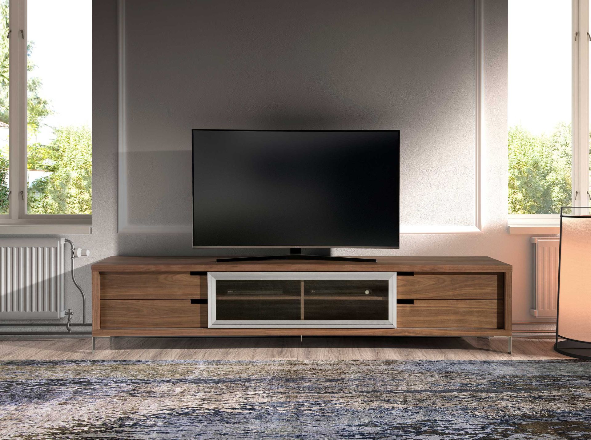 Тумба под ТВ Style орех от фабрики Angel Cerda — безупречное исполнение, верность современному стилю. Тумба Style — это дизайнерский предмет мебели с большой буквы. Натуральный цвет дерева, продуманная эргономика, стильное и небанальное исполнение. Такому изделию нужна центральная зона в гостиной и много места, ведь оно будет рассказывать о вашем вкусе и статусе без слов. Тумба выполнена из шпонированного МДФ, имеет форму вытянутого прямоугольника. Внутри каркаса — три секции, состоящие из выдвижных ящиков и полок. Слева и справа — выдвижные ящики с доводчиками. В центре — четыре полки, которые закрывает перегородка из матового стекла в металлической раме. Перегородка перемещается влево-вправо по принципу «купе». Поддерживают тумбу пять хромированных ножек — по одной с каждого угла и в самом центре основания каркаса. Благодаря прочности материала и симметричному расположению опор друг от друга, весовая нагрузка будет равномерно распределяться, тумба будет устойчива на любом напольном покрытии. Размеры изделия: длина — 238 см, высота — 51 см, глубина — 53 см. Вес составляет 79 кг. Ножки потребуется прикрутить самостоятельно. Инструкция и крепеж входят в комплектацию.