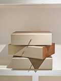 Выдвижная система ящиков со скрытым креплением. Два верхних выдвижных ящика могут быть смещены относительно нижнего ящика тумбы. Внутренние размеры ящиков:- глубина 27 см,- ширина 47 см,- высота 8 см.