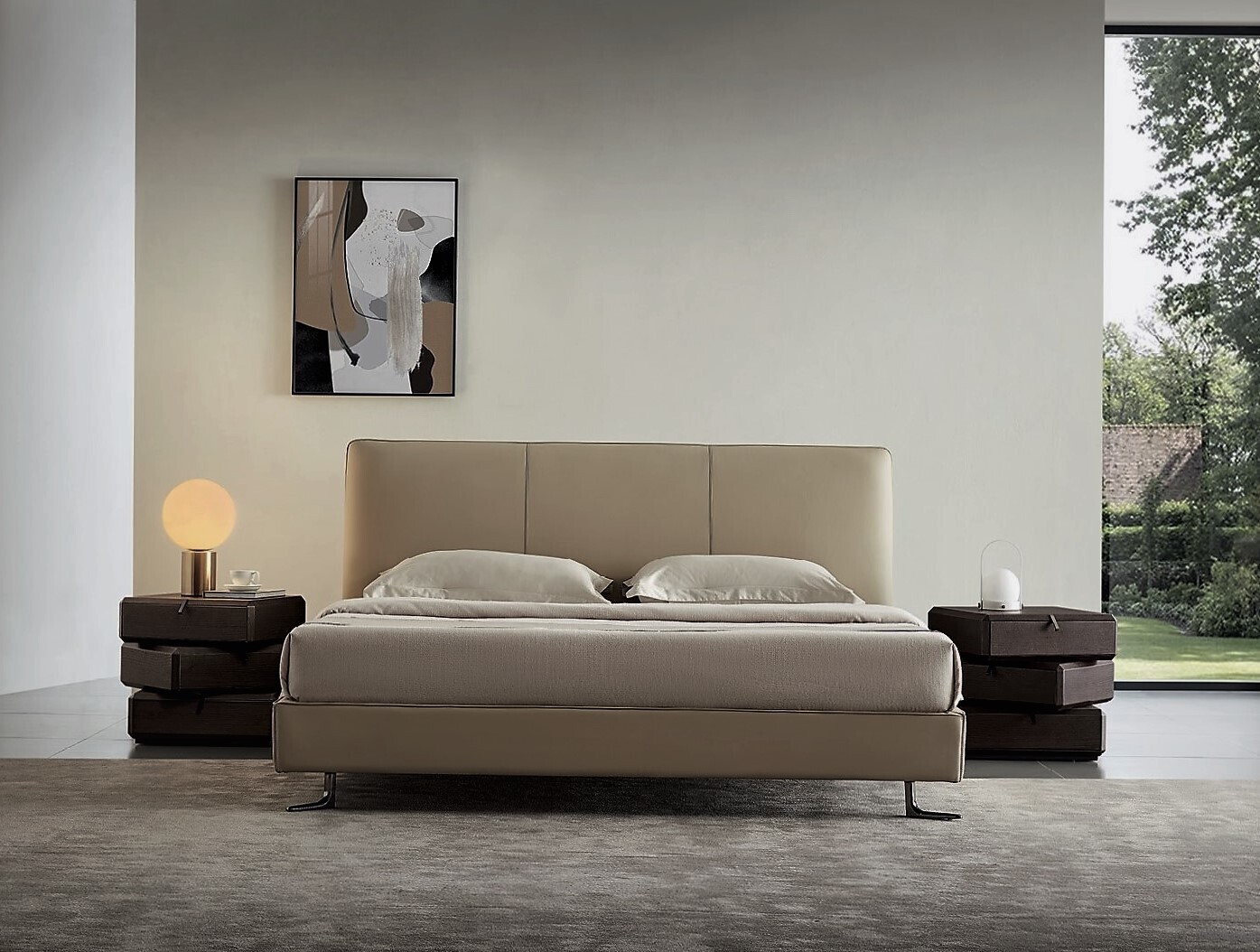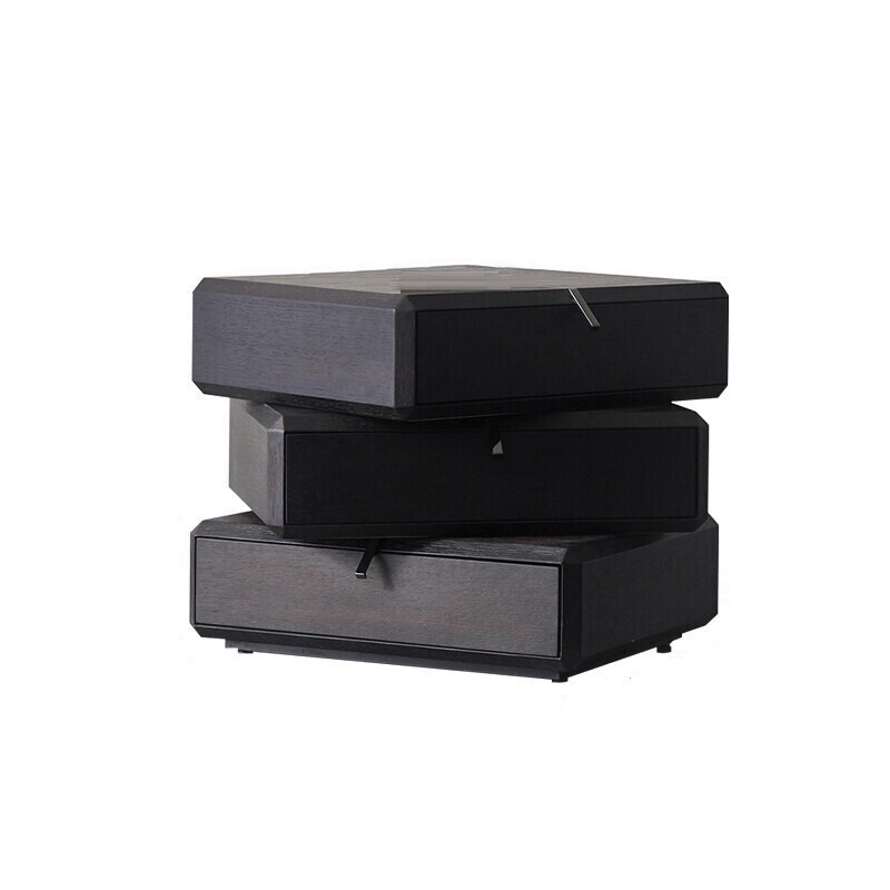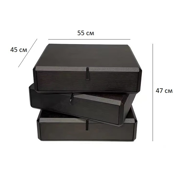 Отделка выполнена из натурального шпона венге. Выдвижная система ящиков со скрытым креплением. Два верхних выдвижных ящика могут быть смещены относительно нижнего ящика тумбы. На дне ящиков покрытие - черный бархат. Ручки ящиков - глянцевый черный хром. Внутренние размеры ящиков:- глубина 27 см,- ширина 47 см,- высота 8 см.