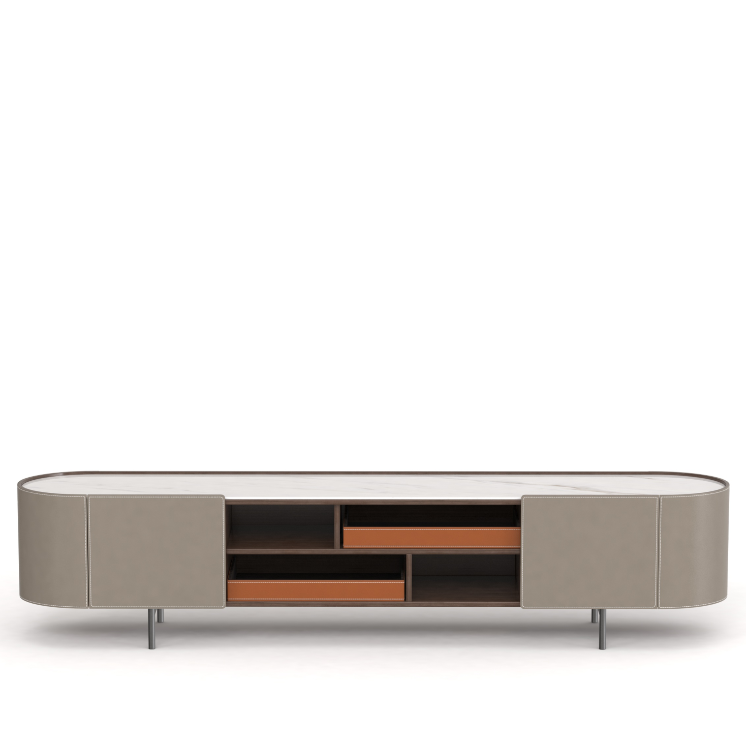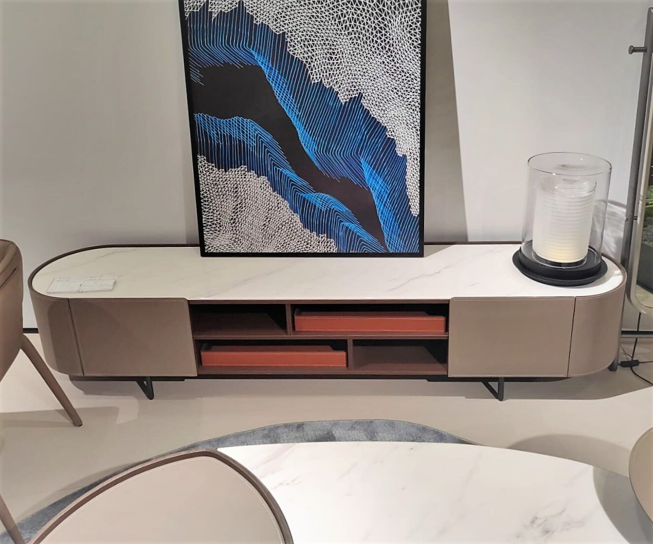 Тумба идеально сочетает эстетику и функциональность, предлагая пространство для хранения мультимедийных устройств и декоративных элементов.