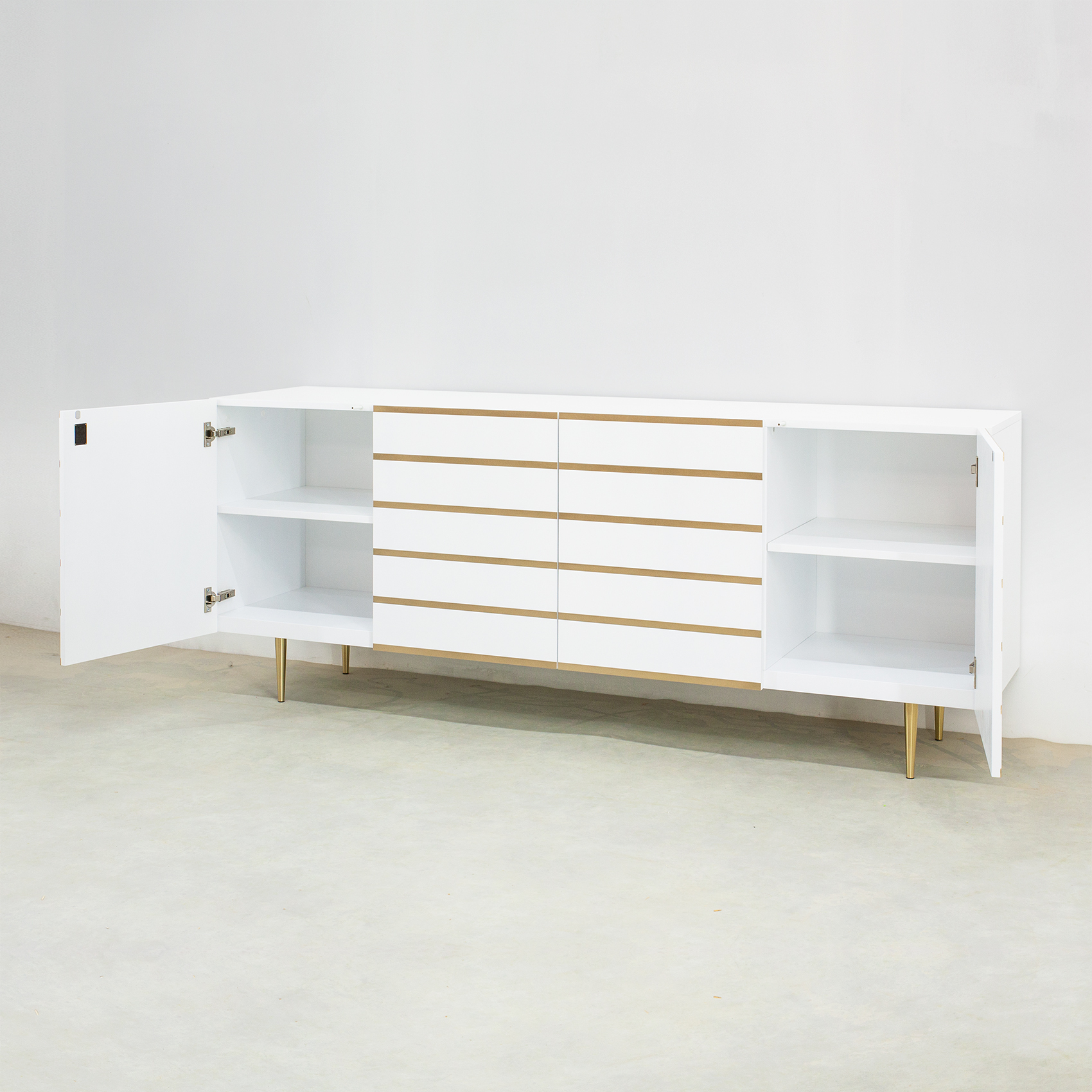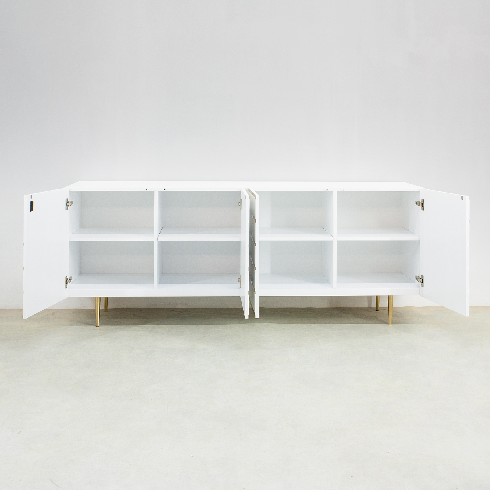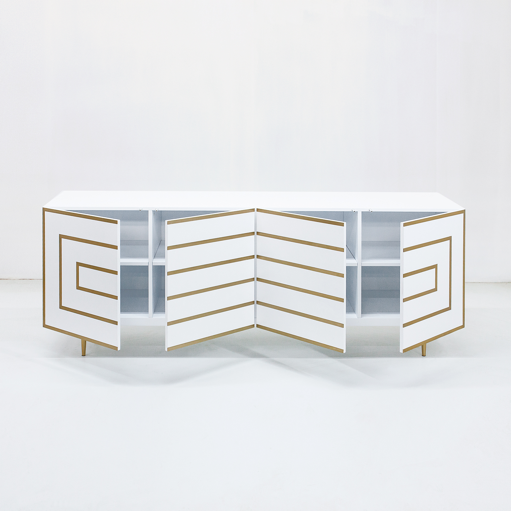 Роскошное сочетание белой эмали и декора из латуни. Материалы: МДФ, белая эмаль, декор из латуни, фурнитура - петли с механизмом tip-on. Конфигурация: 4 двери (полки) Изделие поставляется в собранном виде.