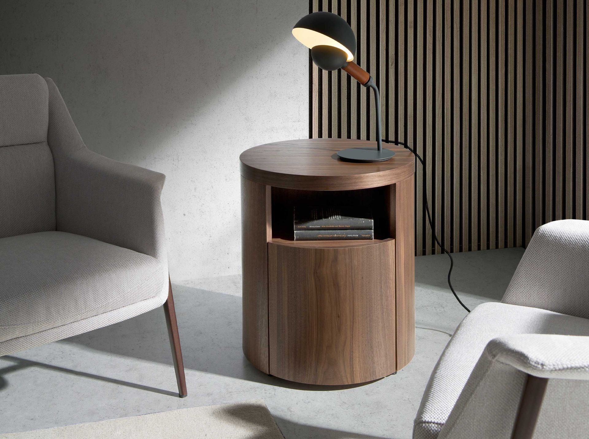 Тумбочка LE313-NOGAL от Angel Cerda — впечатляющий дизайн и стильный шпон ореха. Эта прикроватная тумбочка однозначно выделяется своим оригинальным и изумительным дизайном. Ее внешний вид удивительным образом напоминает часть отесанного бревна, в котором проделано углубление для полки. Однако, при более пристальном рассмотрении, замечаешь, что у изделия также предусмотрена и дверца, за которой спрятан ящик для хранения личных вещей. Данная прикроватная тумбочка имеет цилиндрическую форму. Вверху предусмотрена открытая полка, а ниже — ящик, дверца которого едва заметна. Она не имеет ручек, а открывается путем нажатия. Ящик оснащен доводчиком и прочными металлическим направляющими, обеспечивающими долгую эксплуатацию. Материал изготовления — шпонированный МДФ цвета натурального орехового дерева с природным орнаментом. Тумбочка выше стандартных аналогов. Ее высота — 50 см. Поэтому, при желании, ее можно использовать не только в качестве прикроватной тумбочки, но и как столик. Тем более, что высота «столешницы» легко выдержит высокую весовую нагрузку, так как составляет несколько сантиметров. Да и диаметром тумбочка также впечатляет — 48 см. Благодаря этому, данная модель вполне универсальна. Ее можно расставлять в любой комнате и использовать по-разному. Столик приходит в собранном виде. Его вес составляет 20 кг.