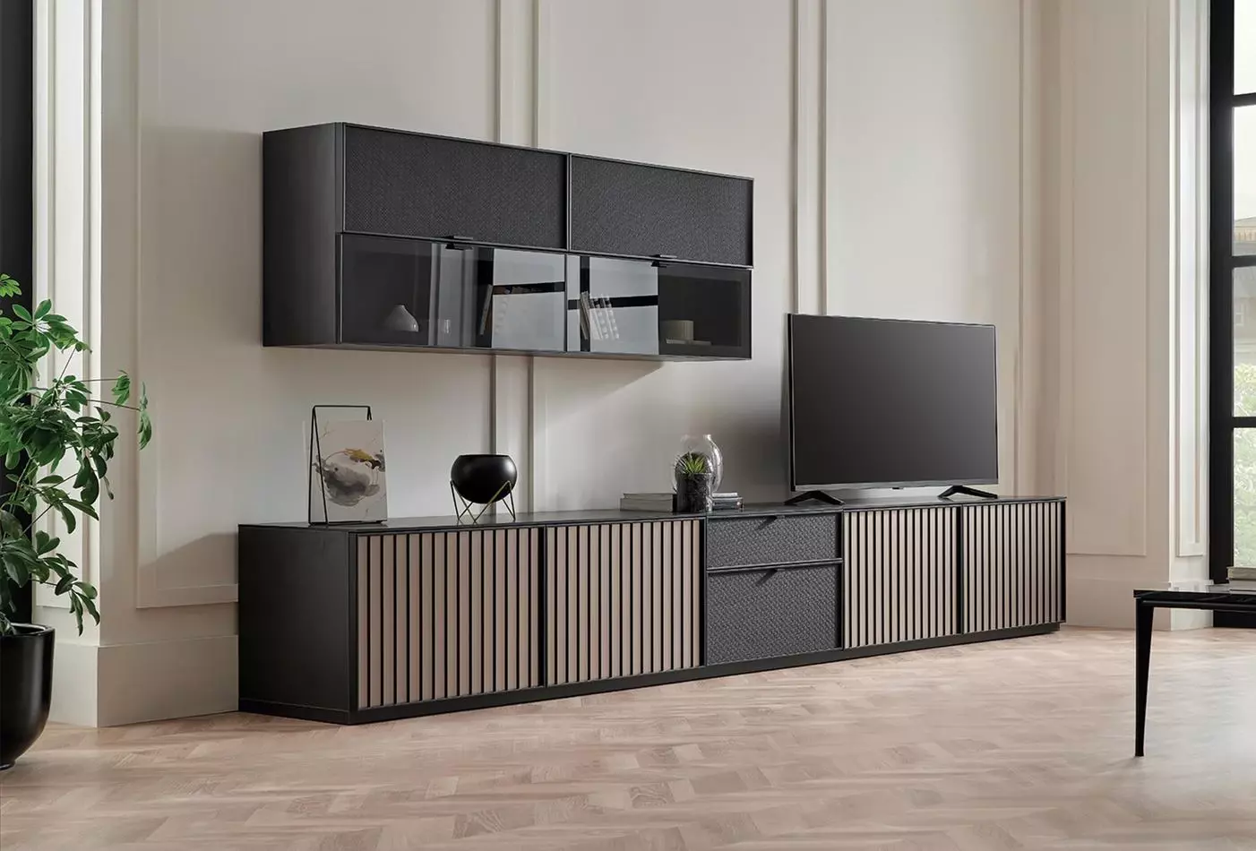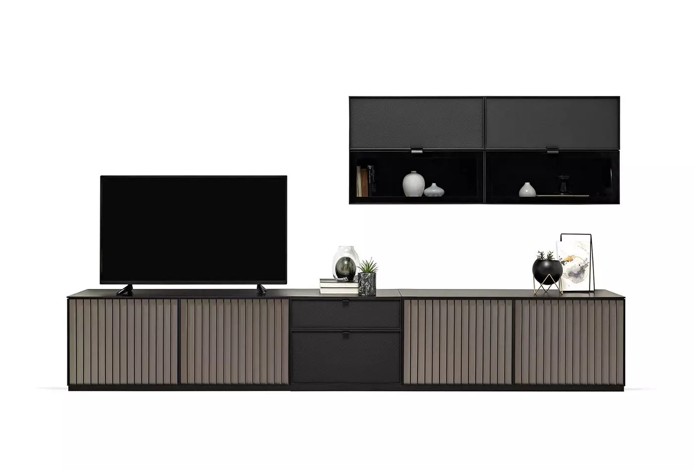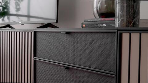 Благодаря сочетанию черной профильной рамы, эффекта металла на корпусе, черных матовых металлических ручек, и кожаным вставкам на поверхности фасада ТВ тумба подчеркивает элегантность и утонченность интерьера.