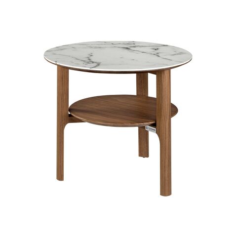 Угловой журнальный столик CP1806-I от фабрики Angel Cerda – изящное дополнение к современному интерьеру, в котором есть место смелым экспериментам. Угловой журнальный столик CP1806-I очаровывает с первого взгляда. Изюминка в его дизайне – это комбинация двух материалов. Совместить мраморную столешницу с ореховым деревом – смелый шаг, превращающий рядовое изделие в особенное. Столик сумеет украсить интерьер, в котором приветствуются нестандартные решения, где ценят естественную красоту природных материалов. Столик имеет круглую форму. Сверху деревянная столешница покрыта керамической панелью с имитацией под мрамор. Верхний слой – ударопрочное стекло, которое стойко переносит воздействие высоких температур и защищает керамический слой от сколов и повреждений. Удерживает столешницу опора, состоящая из трех ножек, равноудаленных от центра. Они сделаны из МДФ покрытого ореховым шпоном – прочной породы, гарантирующей стойкость к высоким весовым нагрузками. Техника их обработки напоминает ручной сруб, что придает колоритности изделию. Посередине ноги соединены тремя перекладинами, на которых находится полка. Она круглая, сделана из шпона орехового дерева. Масса столика составляет 13 кг, высота – 50 см. Изделие не требует сборки. В коллекцию CP1806 входят также тумба под ТВ, прикроватная тумбочка, комоды, прямоугольный журнальный столик. У всех изделий аналогичный дизайн.