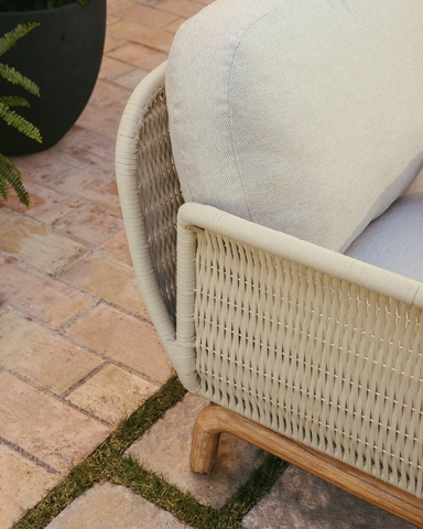 Диван Alipa воплощает гармонию комфорта, долговечности и вневременного дизайна. Его прочная конструкция из массива акации отличается уникальной текстурой, придающей ему характер и сбалансированный вид. Сиденье сплетено вручную из устойчивого к УФ-излучению шнура, который сохраняет свою прочность и внешний вид при длительном использовании. В комплект входят съемные подушки для удобства ухода и чистки.