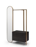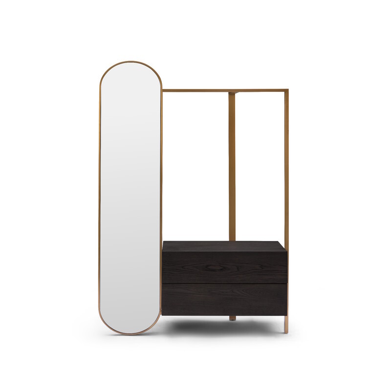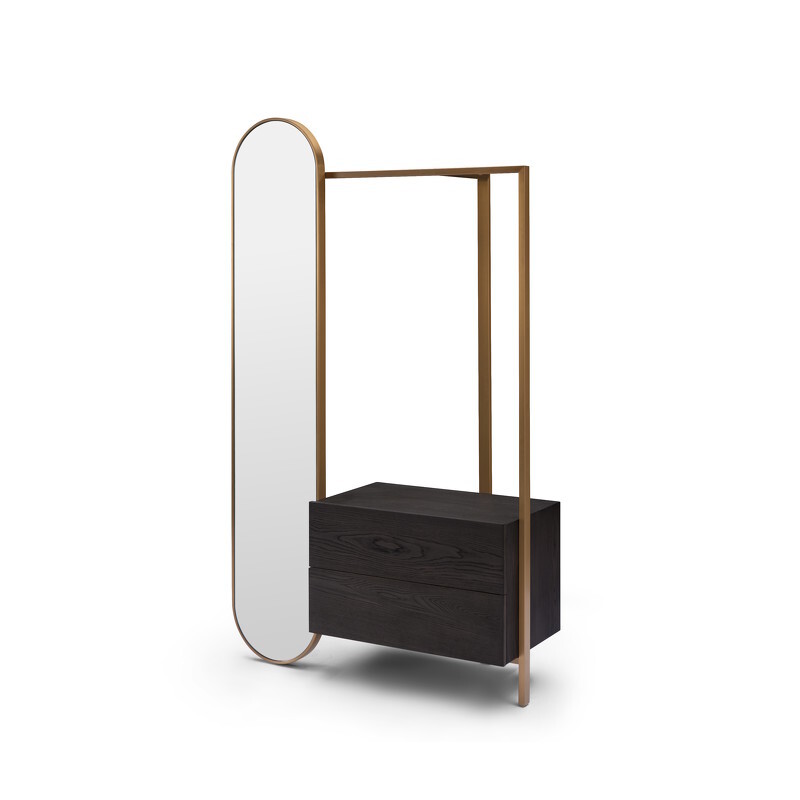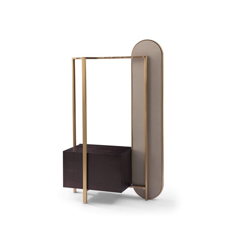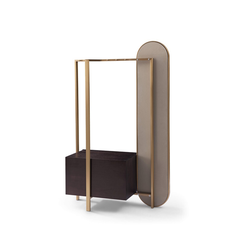 Напольная вешалка для одежды от бренда Fratelli Barri в современном стиле. Такой предмет мебели часто ставят в спальне как напольное зеркало с функцией хранения. Единая конструкция состоит из зеркала, двух вместительных ящиков и штанги. Благодаря ящикам, можно организовать удобное хранение всего необходимого. Ящики оснащены плавным закрытием "soft close". Тумба с ящиками изготовлена из высококачественного МДФ. Отделка - натуральный шпон ореха тонированный в цвет горького шоколада. Штанга и обрамление зеркала выполнены из нержавеющей стали в цвете латунь.