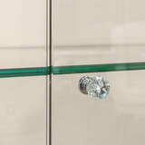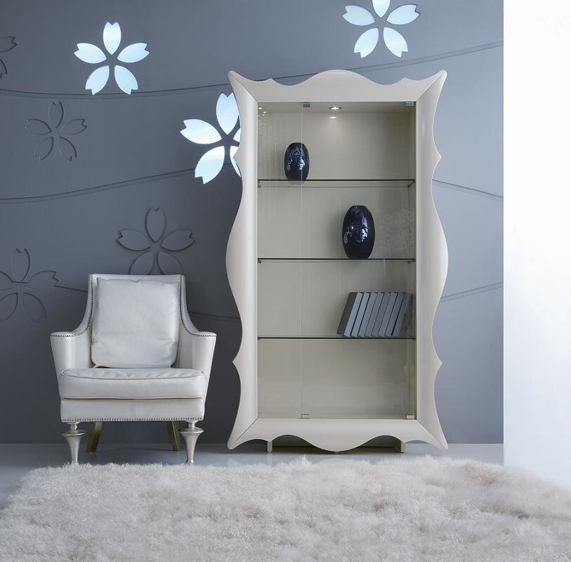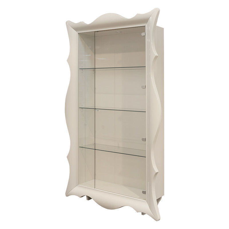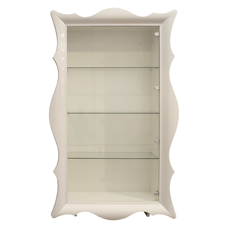 Витрина со стеклянными дверками выполнена в стиле Ар деко. Отделка сверкающий жемчужный лак. Левая узкая створка не открывается, правая открывается и закрывается нажатием. Внутри - 3 стеклянные полки глубиной 26 см. Оснащена внутренней подсветкой. В производстве модели использовано закаленное стекло.