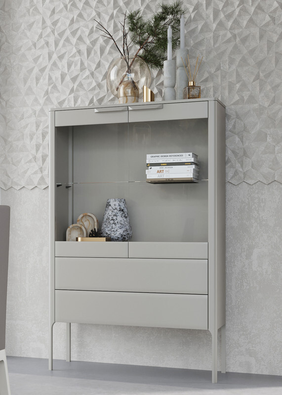 Витрина испанского бренда MOD Interiors с двумя стеклянными дверками, 2 ящиками и подсветкой станет украшением любой гостиной в современном стиле. Корпус витрины изготовлен из высококачественного МДФ высокой плотности, Ножки и ручки - из массива дерева. Отделка - матовый лак в светло-сером оттенке. Ящики снабжены направляющими системы soft-close. Уникальная система последнего поколения добавляет невероятную плавность открывания/закрывания. Высота фасада ящиков 19.8 см Высота дверок 89.2 см Высота ножек 30 см Ширина каждой дверки 44.9 см