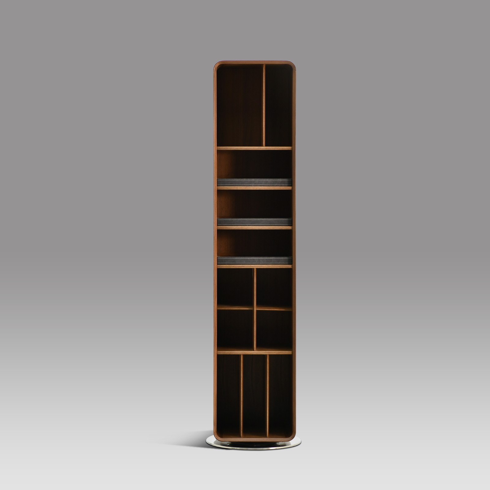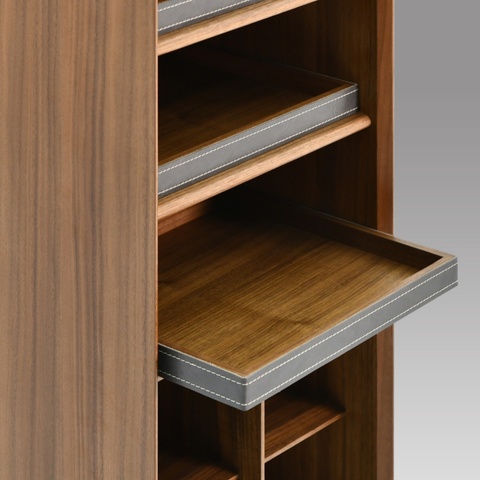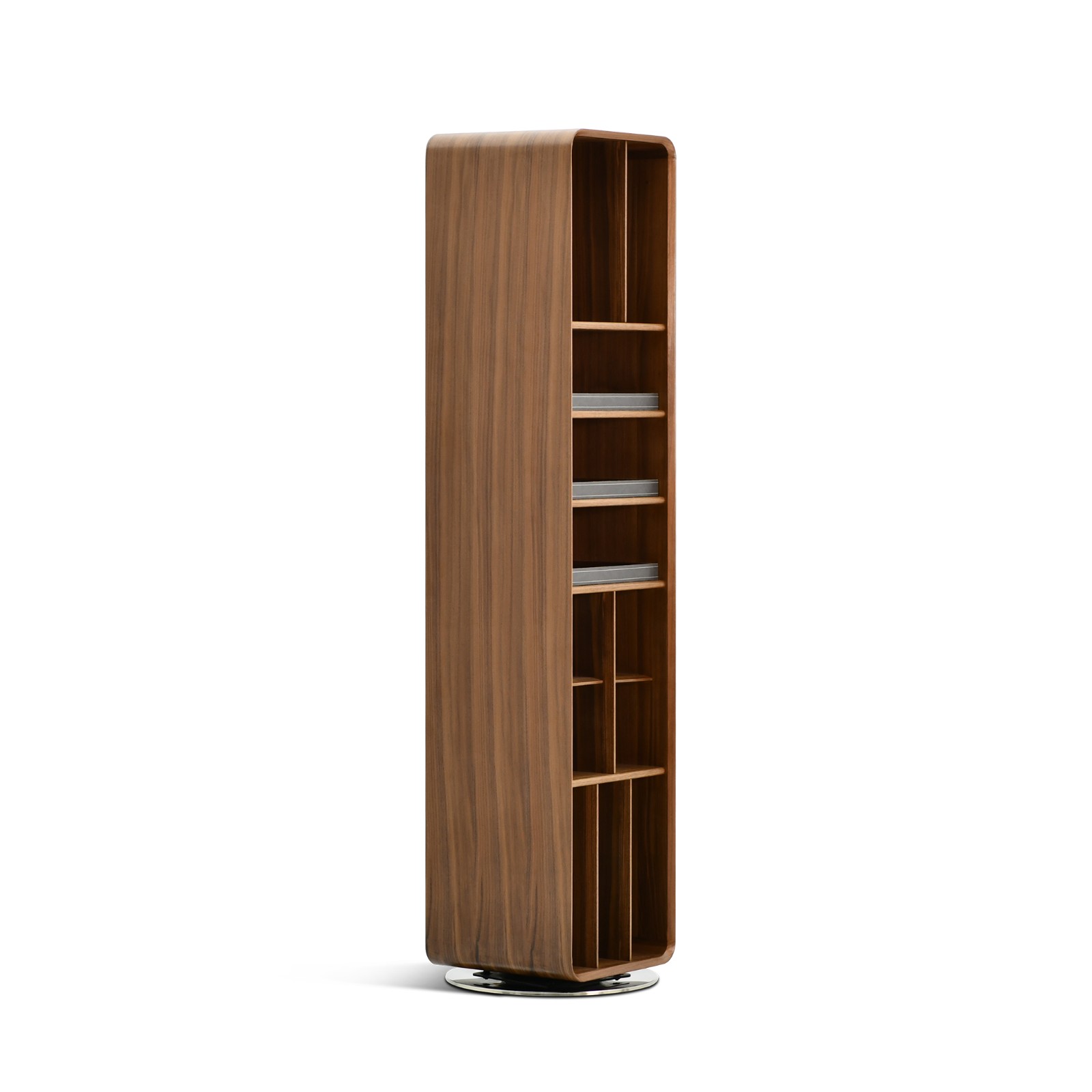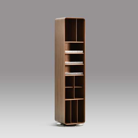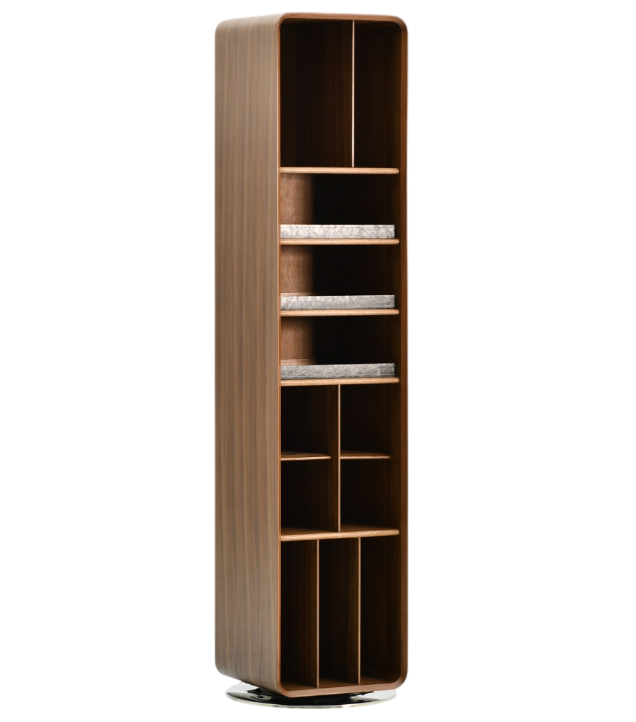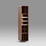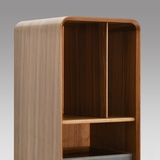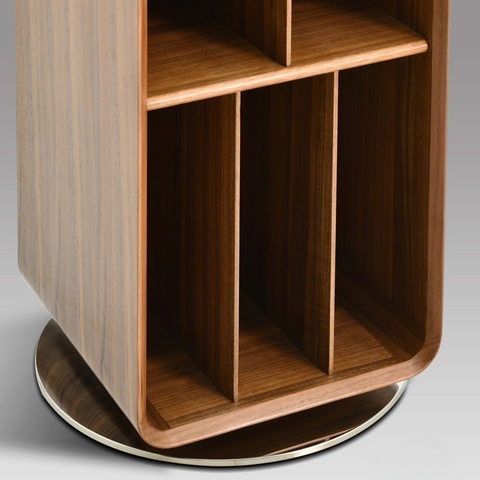 Конструкция стеллажа выполнена из многослойной фанеры с использованием шпона американского ореха.