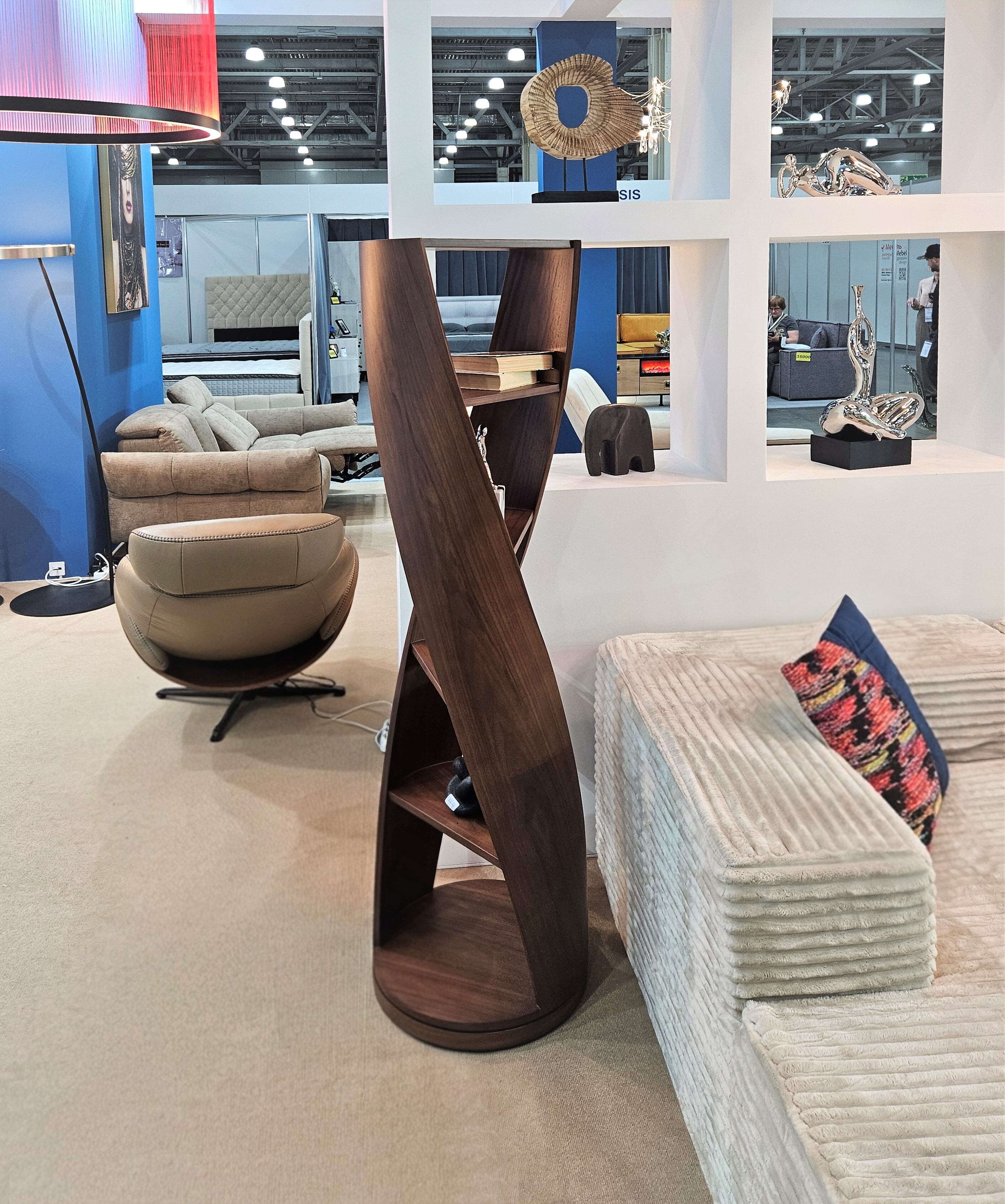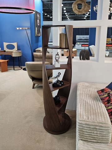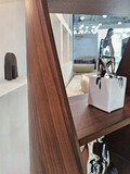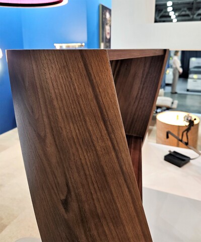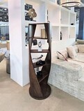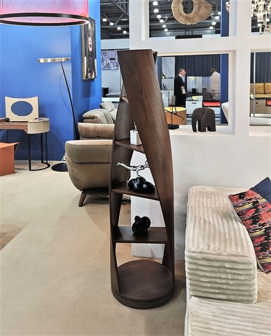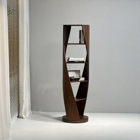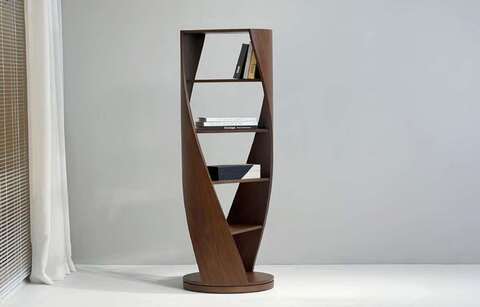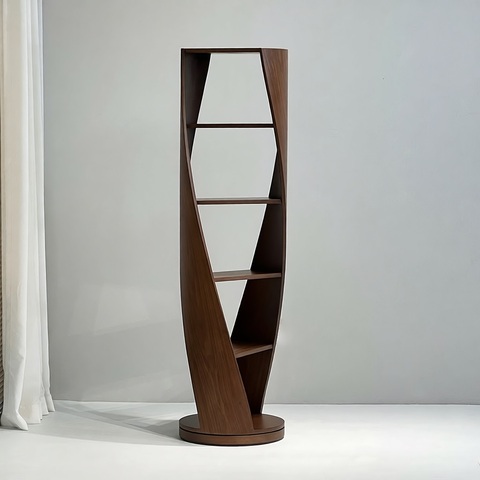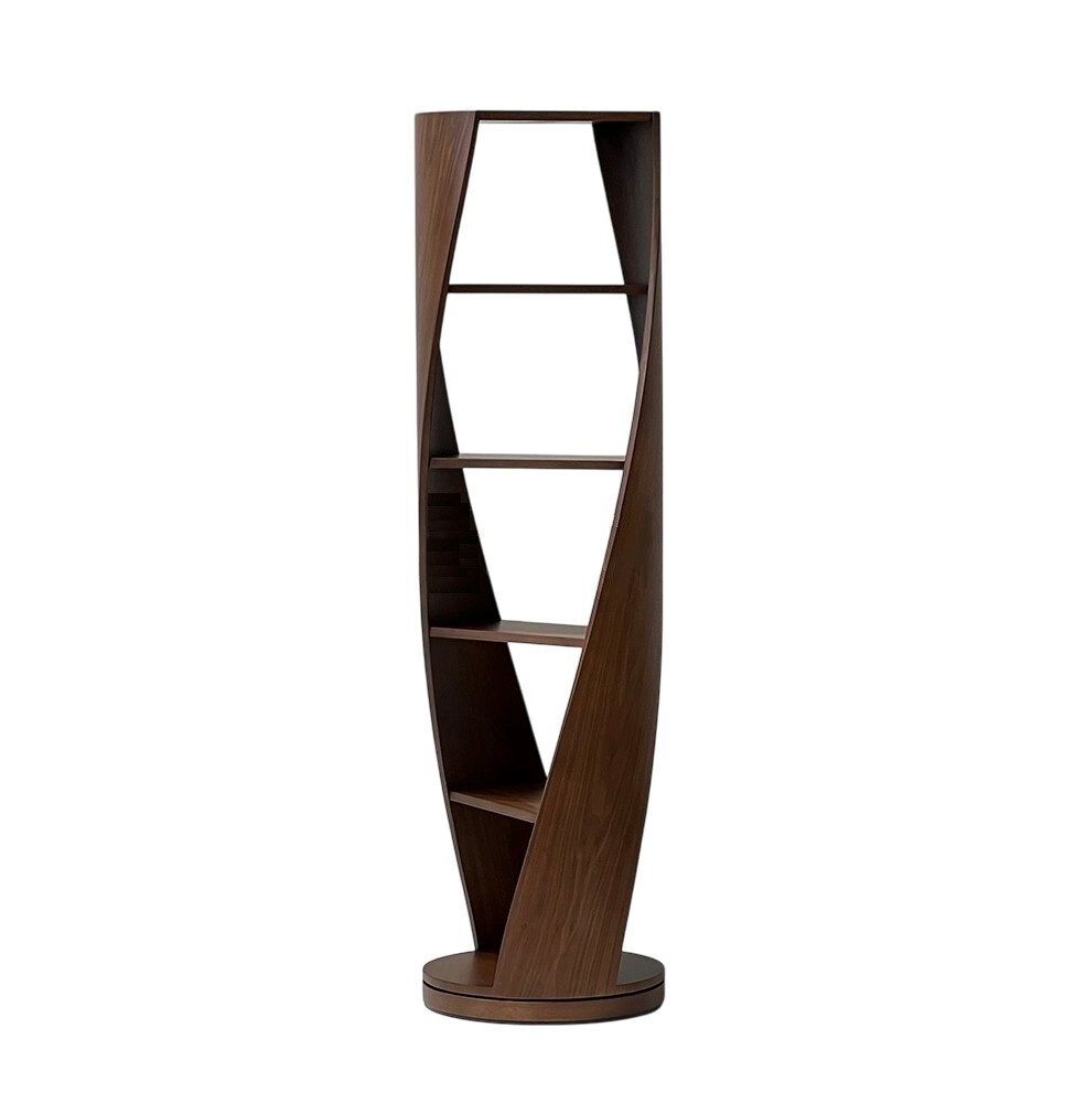 Конструкция стеллажа выполнена из многослойной фанеры с использованием шпона американского ореха.