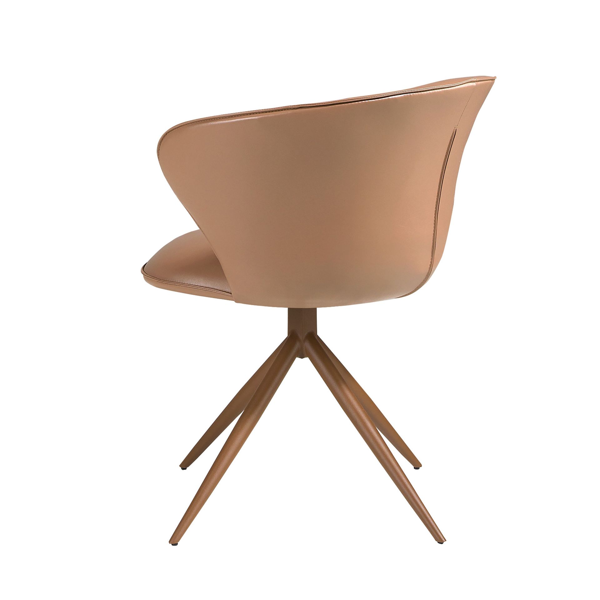 Современный поворотный стул с сиденьем и спинкой, обитыми искусственной кожей верблюжьего цвета. Его коричневые стальные ножки, сочетающие в себе авангардный и вневременной стиль, сделают его незаменимым элементом вашей кухни или столовой. Этот стул от Анхеля Серда сочетает в себе уникальный и индивидуальный стиль бренда с максимальным комфортом и устойчивостью благодаря высокому качеству обивки и оригинальной конструкции ножек.