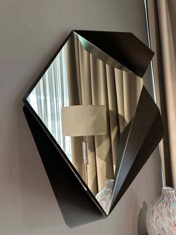 Зеркало от итальянского бренда Fratelli Barri. За счет зеркал в помещении, можно значительно визуально расширить небольшое пространство. Благодаря своей необычной форме, зеркало будет притягивать взгляды и станет акцентом интерьера. Акцентная необычная рама выполнена из металла в отделке черным порошковым покрытием.
