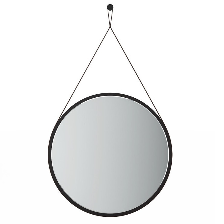 Оригинальное подвесное зеркало в круглой раме на подвесе из высококачественной эко-кожи. Крепление к стене выполнено из металла. Рама зеркала и крепление к стене окрашены в черный матовый цвет. Эко-кожа приятного коричневого оттенка.