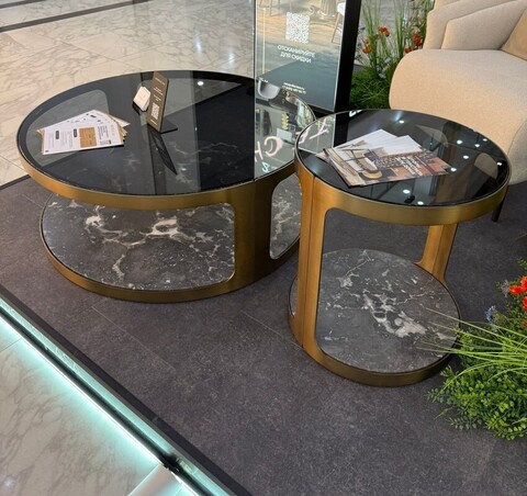 Круглый журнальный столик из коллекции Terni от итальянского бренда Fratelli Barri - идеальное дополнение для современной гостиной. Структура выполнена из нержавеющей стали в цвете латунь, столешница - тонированное закаленное прозрачное стекло в графитовых тонах, база - натуральный мрамор в темно-серых тонах с прожилками.